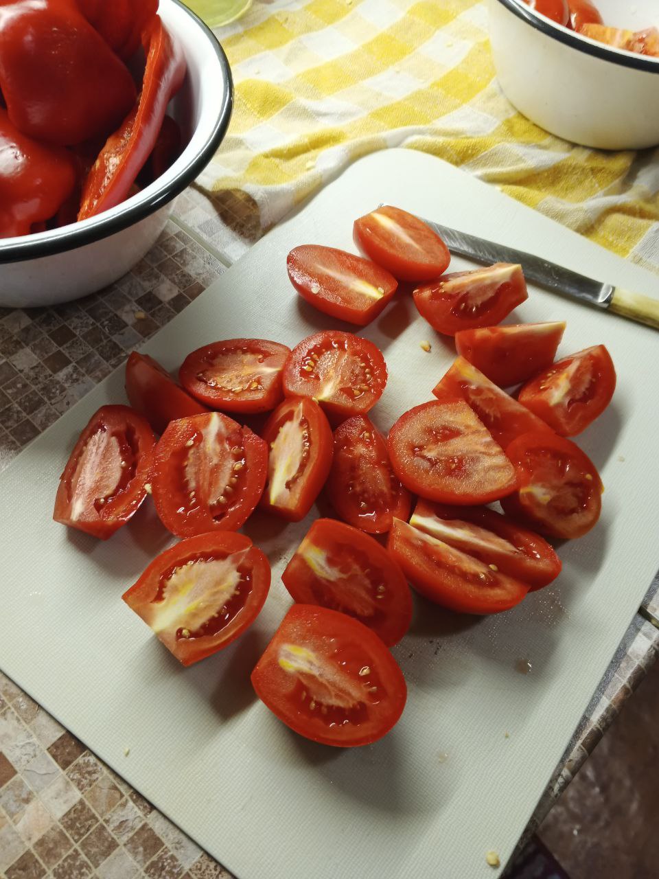 Перемалываем на средней решётке оба вида перцев, помидоры , чеснок и зелень кинзы
