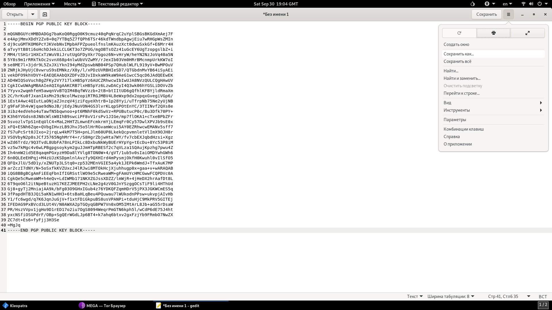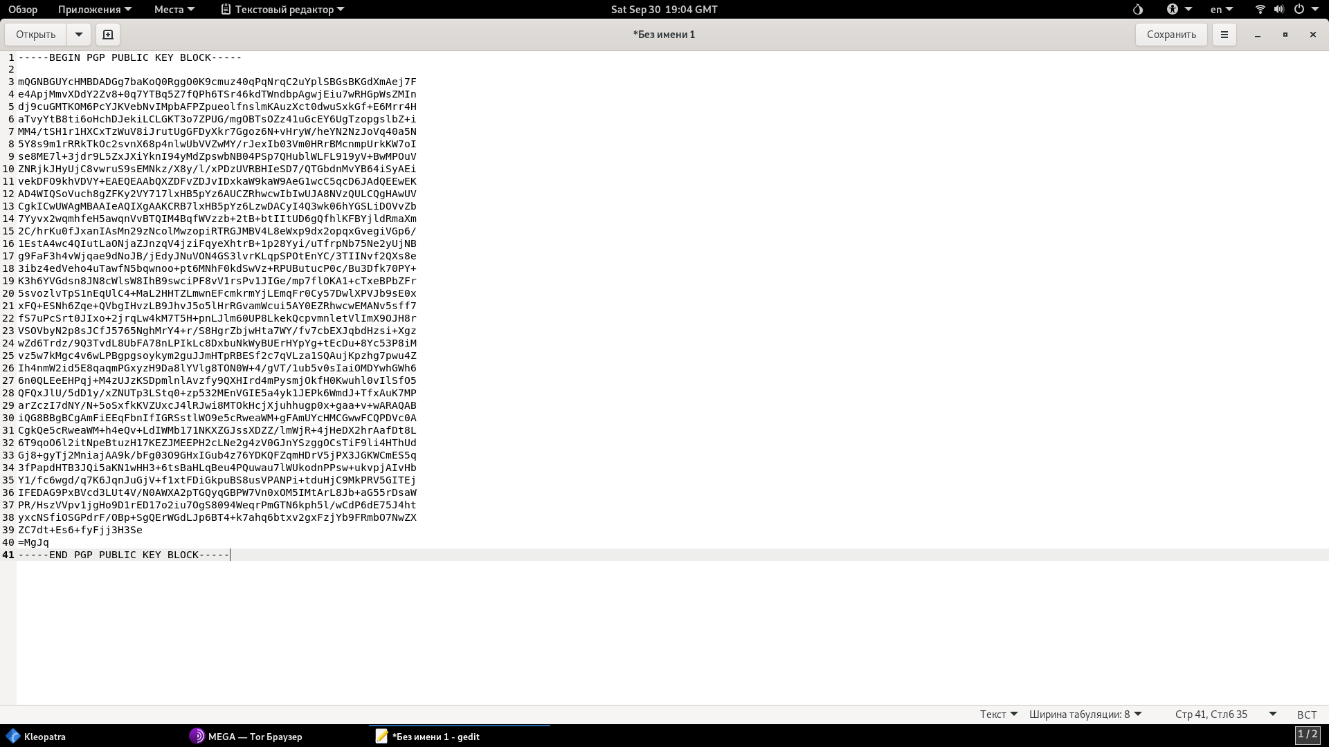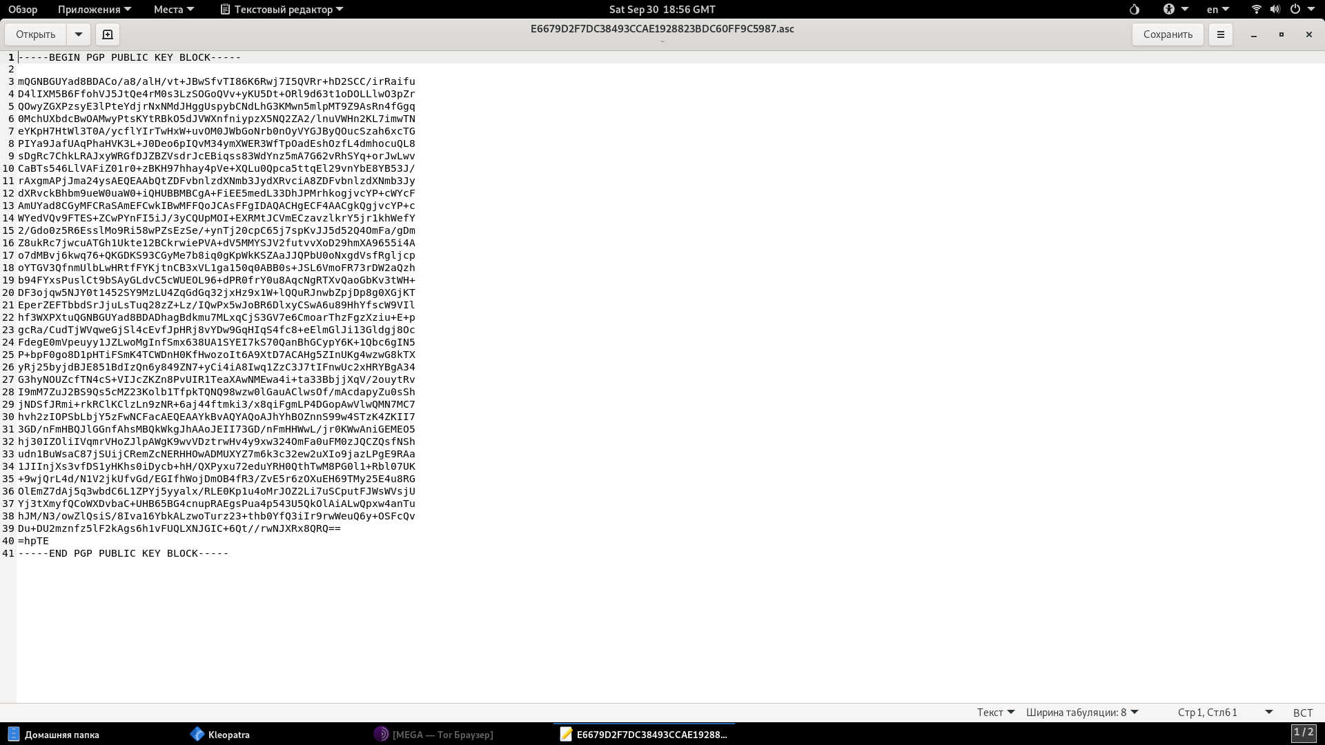 1. Копируем ключ, которым с нами поделились, вставляем его в Текстовый редактор и сохраняем с любым именем и расширением .asc​