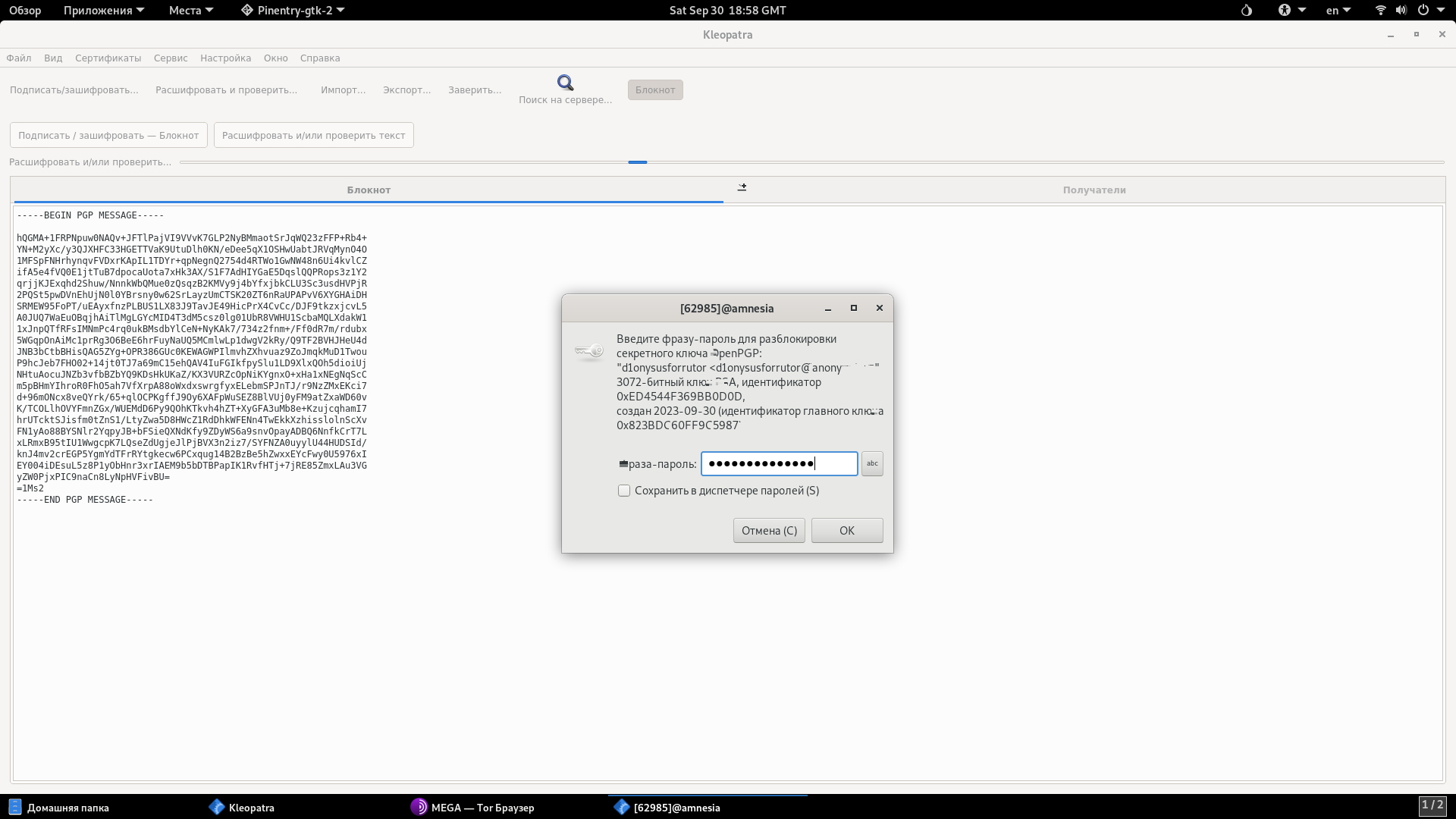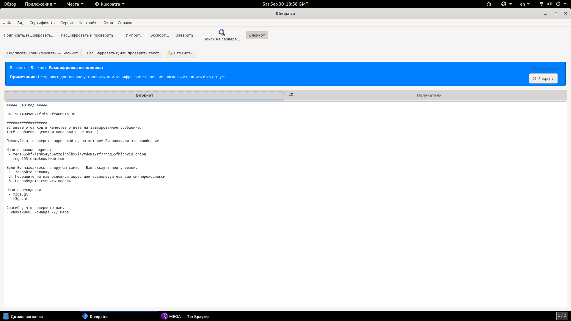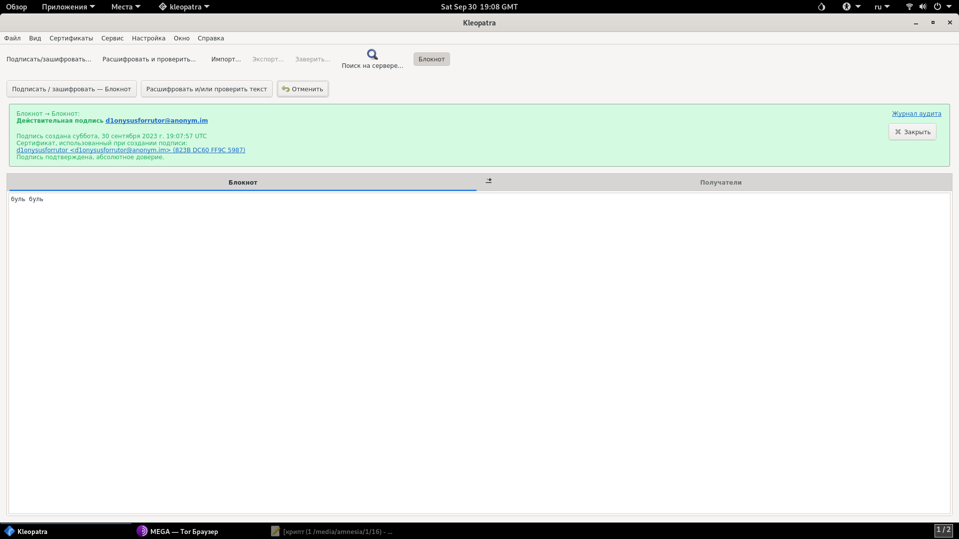 6. Возвращаемся в Kleopatra, кликаем на окно Блокнот, вставляем туда зашифрованное сообщение и выбираем Расшифровать и/или проверить текст.
