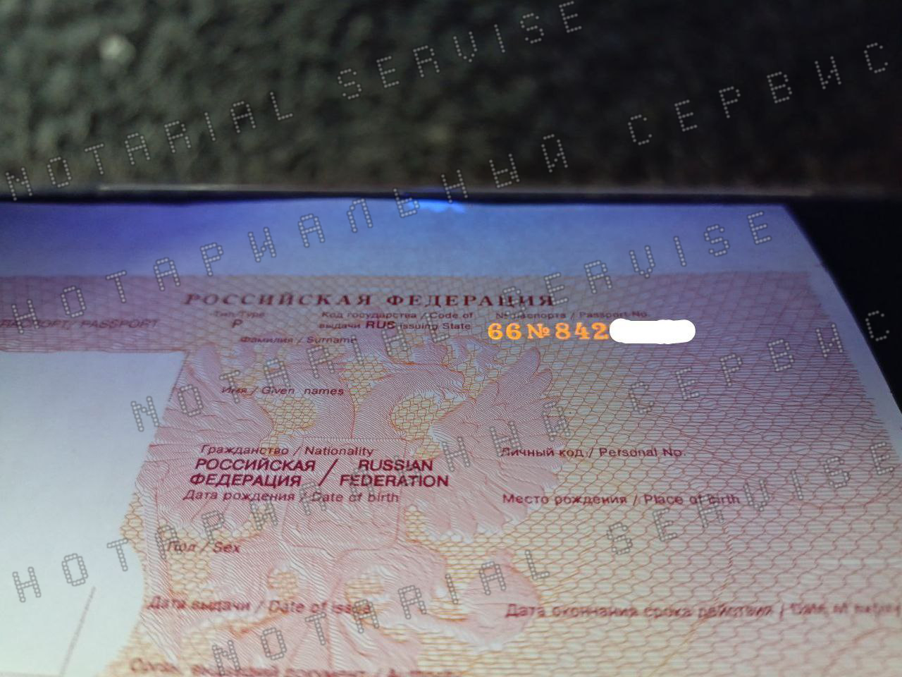 наличие трехтонового водяного знака в виде букв «РФ», регулярно повторяющегося по всей поверхности страницы, а также наличие защитных волосок разных цветов на всех образцах. СВЕЧЕНИЕ В УФ СЕРИИ И НОМЕРА на странице с фото в новом образце. Печать ФМС не на принтере. Наличие металлографической печати(новый образец) и коричневой полосы с орнаментом на последней (20-й) странице паспорта, на первой странице надпись Паспорт гражданина Российской Федерации выполнена читабельно пальцем - наличие тактильности. Наличие защиты на ламинированной пленке. ОВИ краска. Наличие ИК-защиты и элементов, люминестирующих в УФ-лучах. Мчс на странице с фото соответствует раскодровке гознака 100%, если дубль делается не по скану, а только по данным.