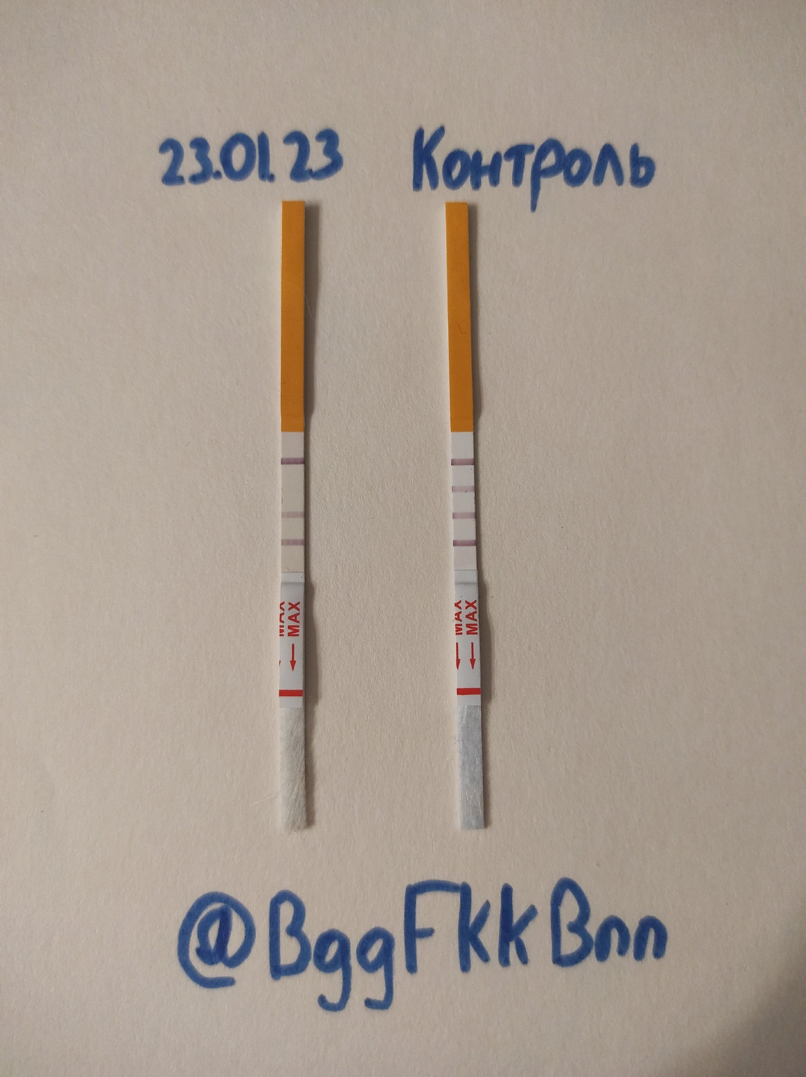 В начале эксперимента произведён контрольный тест, полоска было погружена в водопроводную воду. В целях экономии тест-полосок в течении всего эксперимента мы будем использовать один и тот же контрольный тест для визуального сравнения.