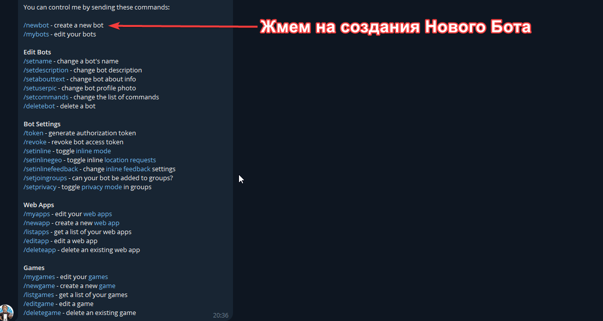 Здесь нам будет предложено перейти в официальный телеграмм бот для создание ботов