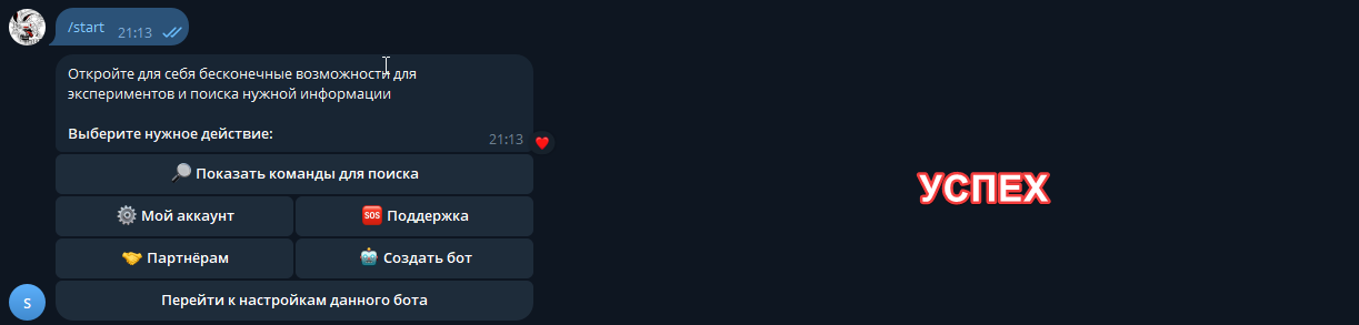 И на выходе мы получаем следующее сообщение, которое содержит сыллку на Ваш Бот и API ключ.