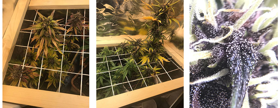 К 6 неделе рост немного замедлился и по большей части направился именно в шишки. Соцветия начали набухать и приобрели прекрасный фиолетовый цвет) Но на левом кусте начали желтеть листья, было похоже на недостаток азота, впервые столкнулся с этим на цветении, обычно такое случалось на веге… Но как я понял проблема была в другом, такое можно наблюдать в самом конце цветения, прям перед харвом, тогда мне показалось это очень странным, т.к по паспорту он зреет чуть меньше 9 недель и я решил просто ждать. С правым же все было хорошо. Лью уже по 1.5 литра на горшок. Запах усиливается.