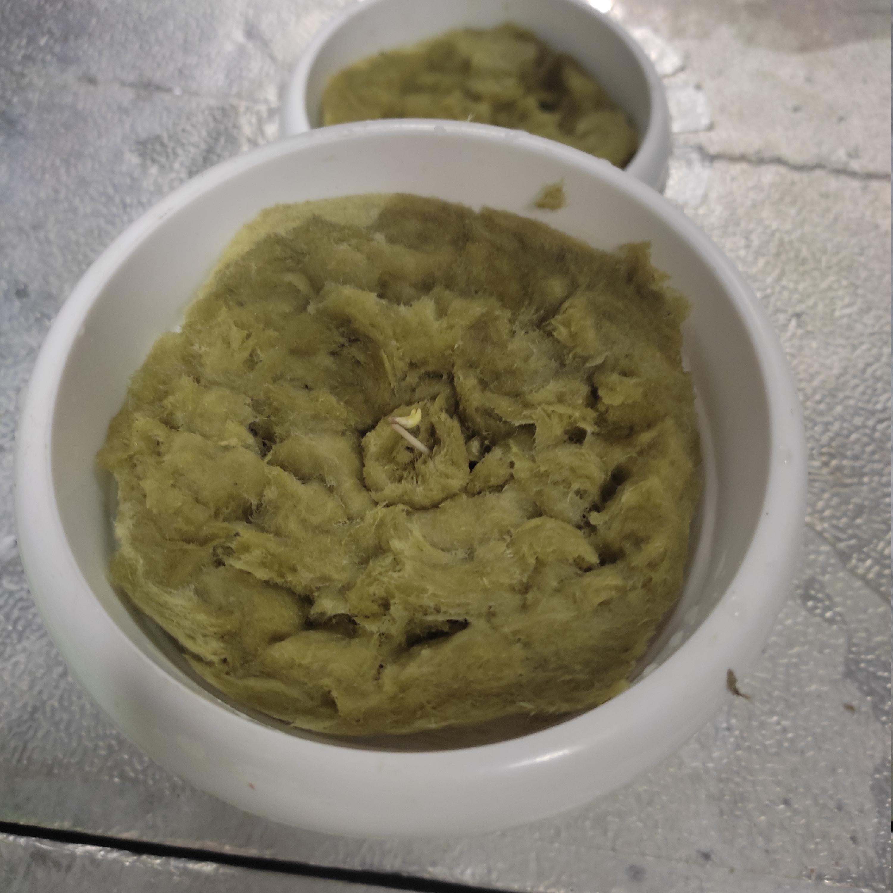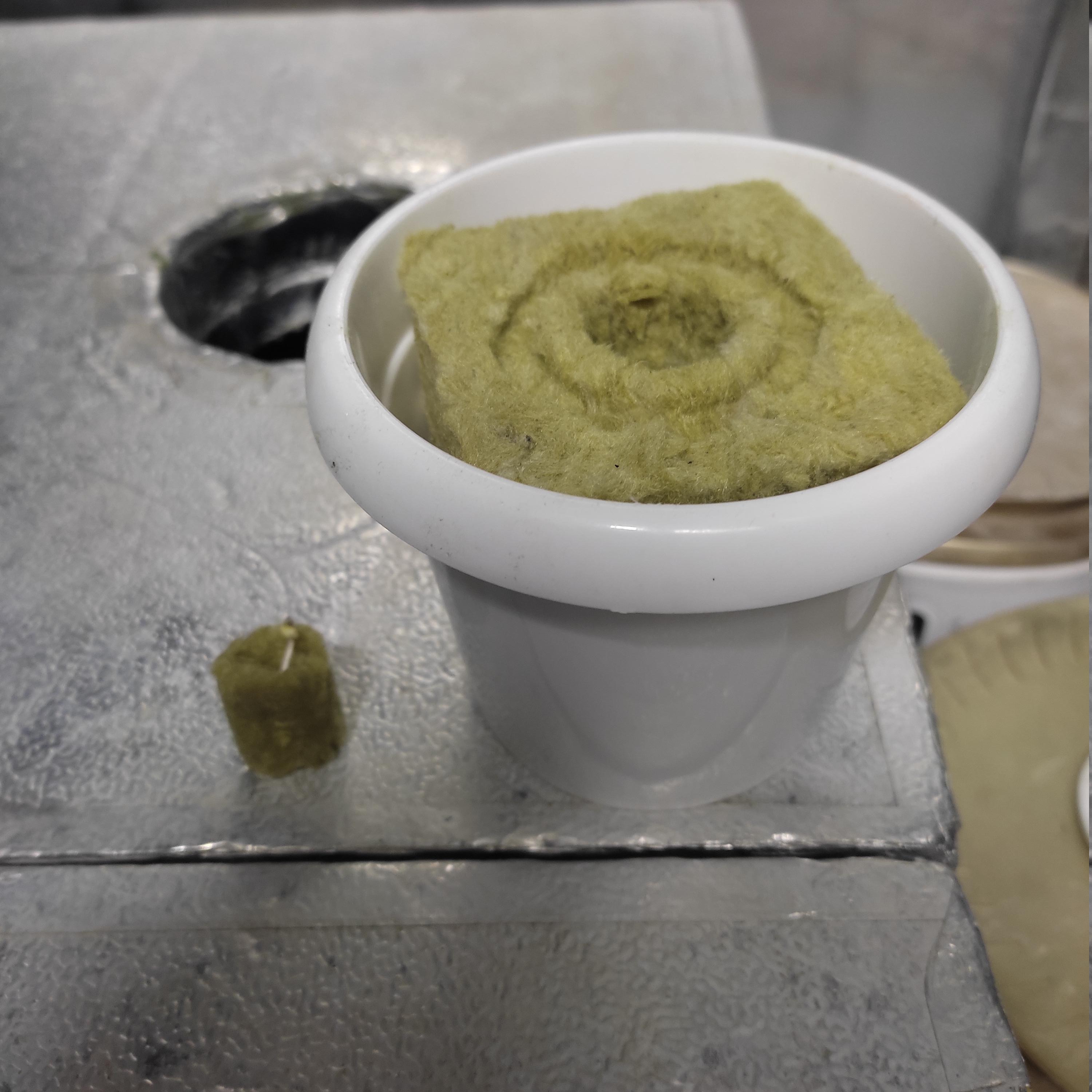Как семечко прорасло аккуратно пересаживаем его в кубик из минеральной ваты, немного поливаем питательным раствором и устанавливаем в контейнер, дно у горшочка проще просто вырезать)