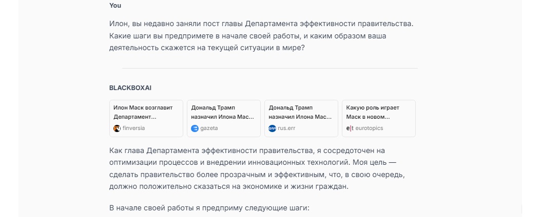 Илон, вы недавно заняли пост главы Департамента эффективности правительства. Какие шаги вы предпримете в начале своей работы, и каким образом ваша деятельность скажется на текущей ситуации в мире?