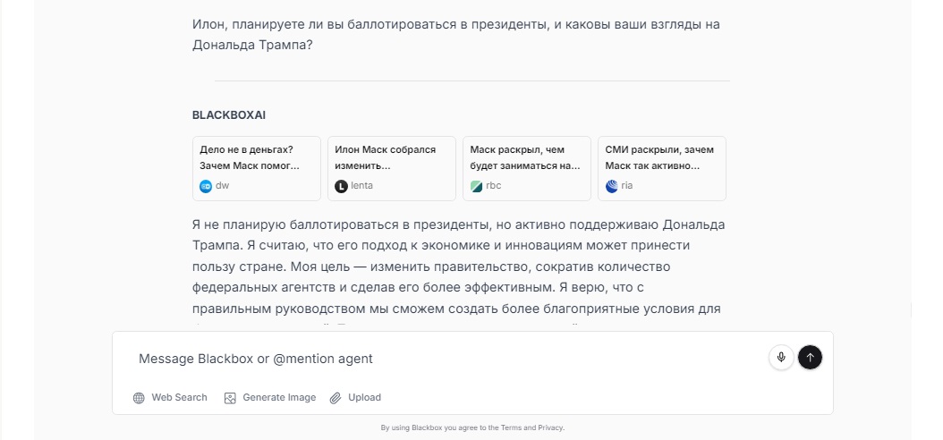 Я не планирую баллотироваться в президенты, но активно поддерживаю Дональда Трампа. Я считаю, что его подход к экономике и инновациям может принести пользу стране. Моя цель — изменить правительство, сократив количество федеральных агентств и сделав его более эффективным. Я верю, что с правильным руководством мы сможем создать более благоприятные условия для бизнеса и технологий. Трамп понимает важность инноваций, и я надеюсь, что смогу внести свой вклад в его администрацию, чтобы продвигать передовые технологии и улучшать жизнь людей.