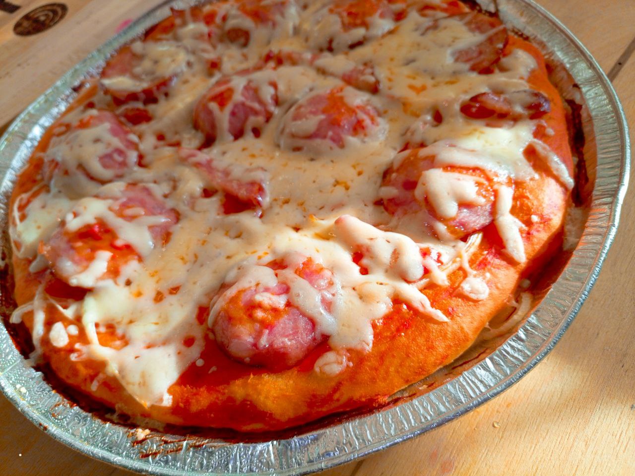 После готовности, достаньте пиццу из духовки, разрежьте на порции и подавайте горячей.