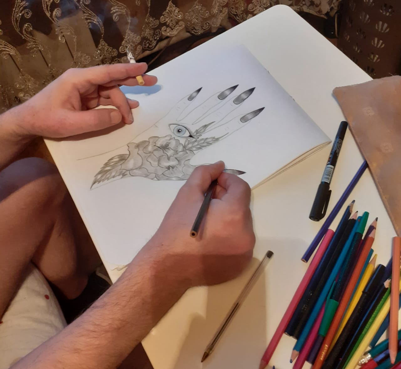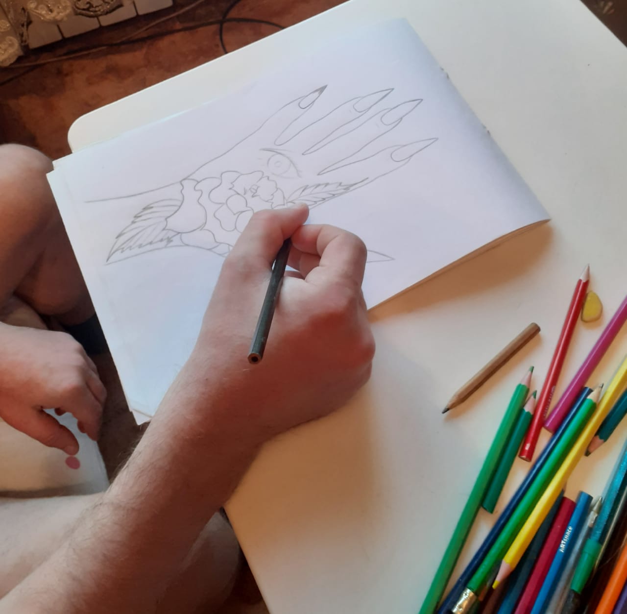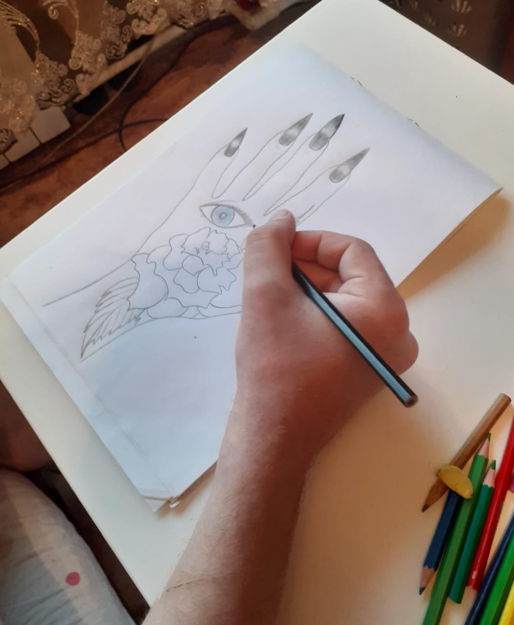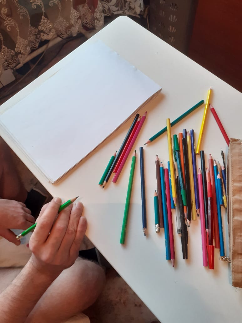подготовка к работе и работа..процесс листы а4 ,восковые карандаши...