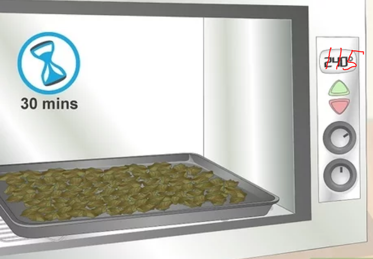 • Разогрейте духовку до 115°C. Идеалом является низкая и хорошая температура. Несмотря на то, что высокая температура удаляет соединения быстрее, она также вытесняет желательные соединения, такие как терпены (которые придают каждой ветви свой уникальный аромат и вкус). 115°C – безопасная температура.