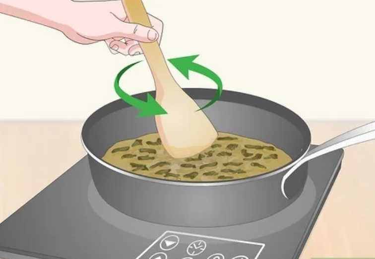 • Добавьте марихуану и уменьшите огонь. Возьмите измельченную траву и хорошо перемешайте, убавив огонь. Ключ к хорошему маслу из марихуаны — «медленное и стабильное», которое высвобождает эфирные масла и соединения, не денатурируя их.