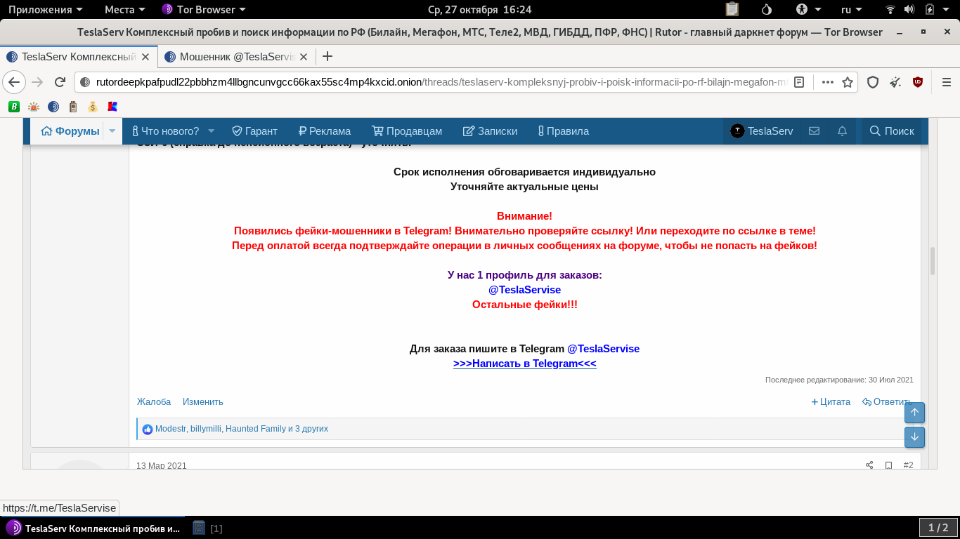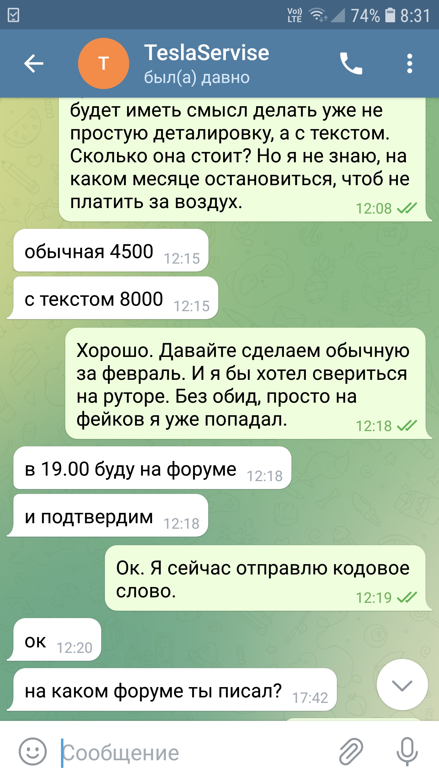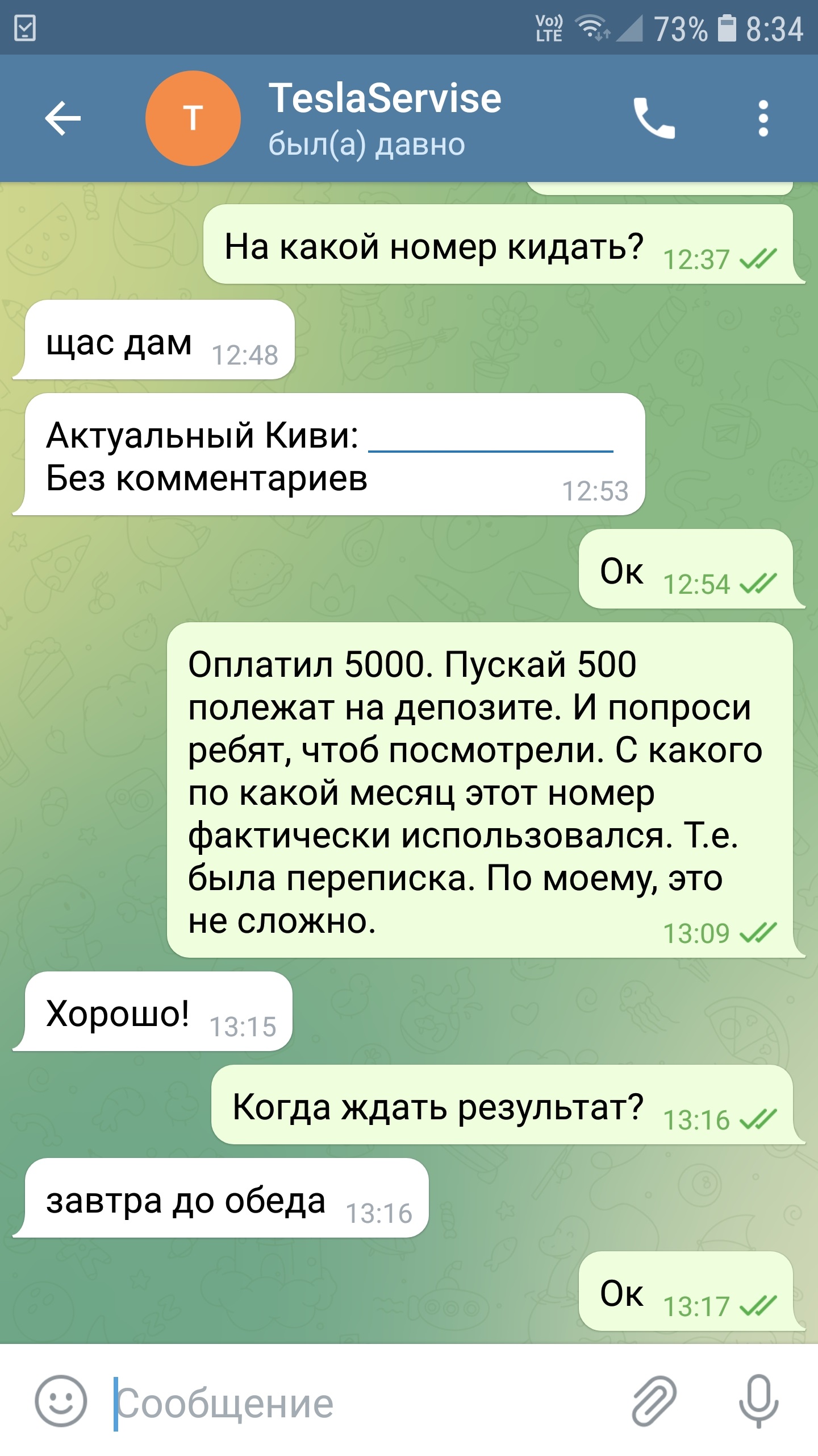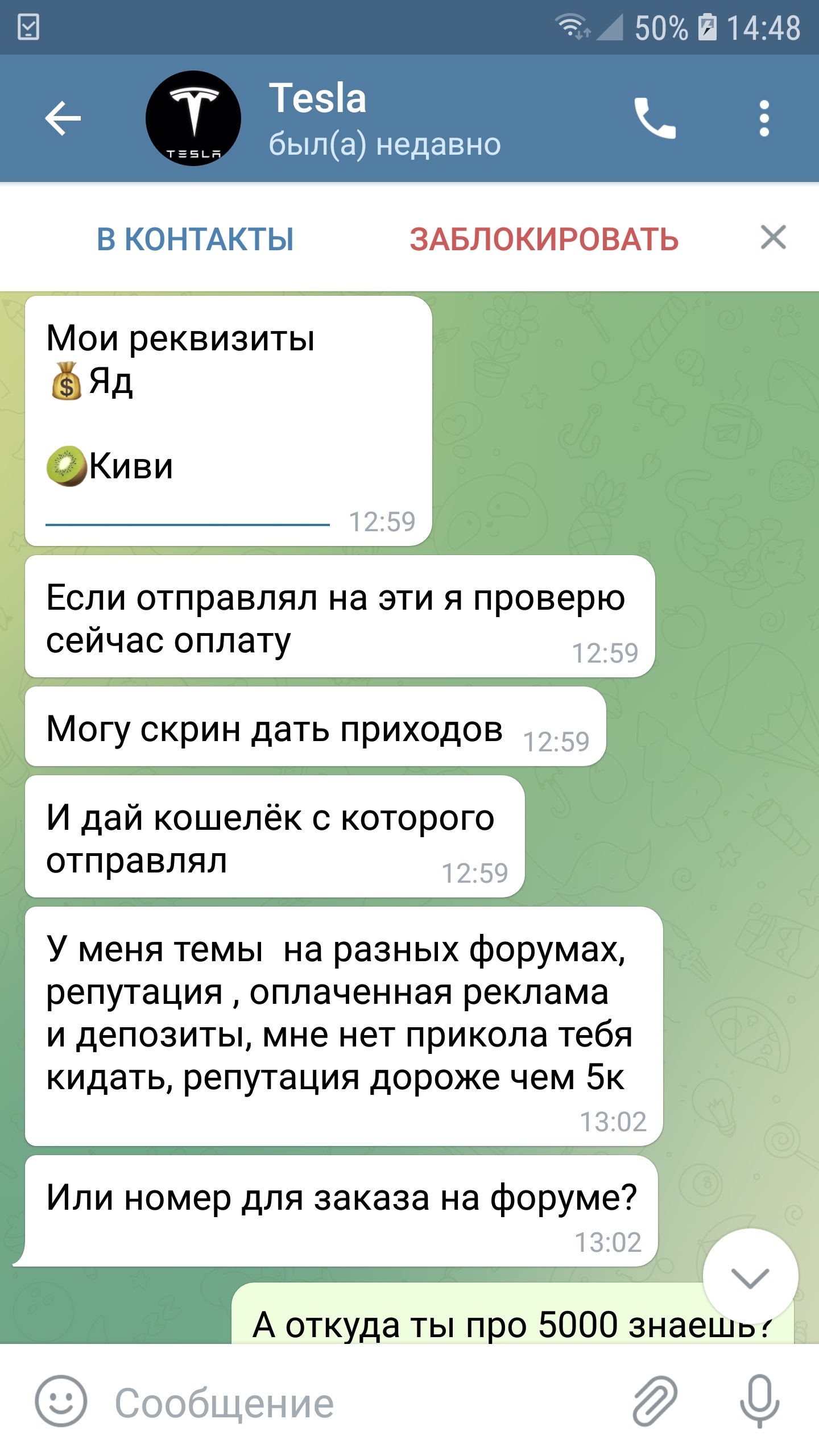 Кинул Тесла. Завёл два одинаковых аккаунта в Телеге. Теперь включает дурака. Якобы я на фейк нарвался. В скринах видна вся информация. Обратите внимание на время, когда первый и второй Тесла прислали кодовое слово для сверки на форуме. И на сумму, которую я заплатил первому, но об этом почему то знает второй. Мне не то что бы денег жалко, просто не приятно когда тебя дураком выставляют. А самое не приятное, что падает доверие в целом, если даже человек в топе до таких вещей опускается и готов репутацией рискнуть, значит дела совсем плохи. Кому тогда доверять? Если что-то не понятно, готов дать комментарии.