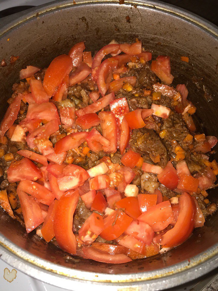 3. Произвольно нарезаем помидоры, отправляем в казан, перемешиваем и тушим еще 10 мин.