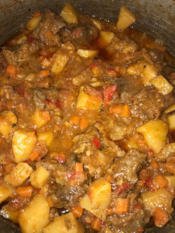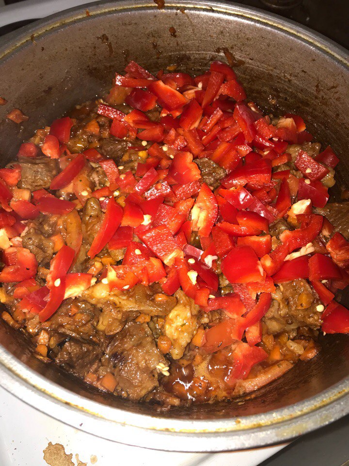5. Закидываем порезанный кубиками картофель, заливаем говяжьим бульоном, перемешиваем, закрываем крышку, огонь убавляем до чуть ниже среднего, и тушим все вместе периодически перемешивая еще 40-50 минут. (пробуйте варево на вкус, если не хватает специй или соли добавляйте на свой вкус)