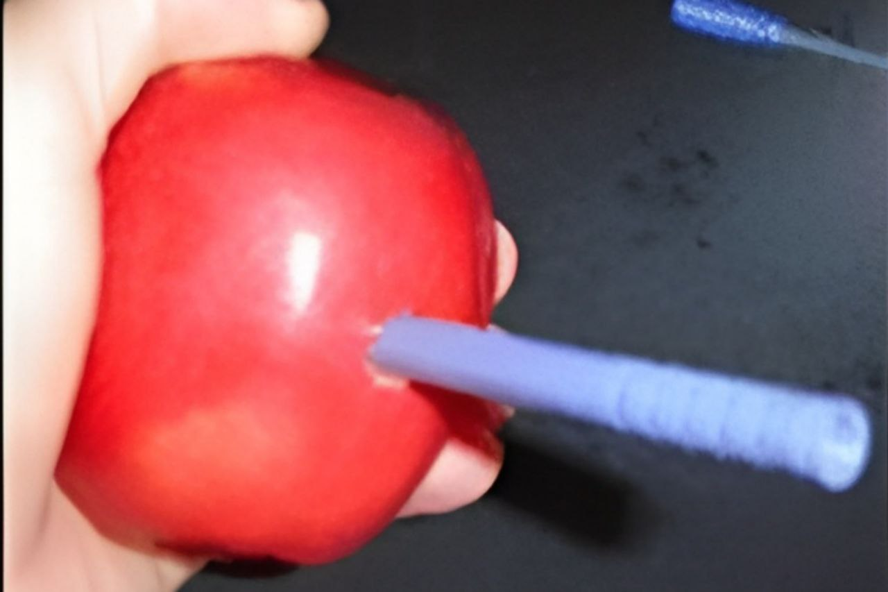 | ШАГ 3. Воткните эту часть ручки (трубочку) в яблоко (желательно под углом примерно 45 градусов). Вдавливайте ручку до тех пор, пока она не покажется внутри вырезанного ножом отверстия. Во время процесса в трубочку неизбежно попадёт мякоть яблока – её необходимо вытащить. Прочистите трубочку так, чтобы внутри неё ничего не было. |