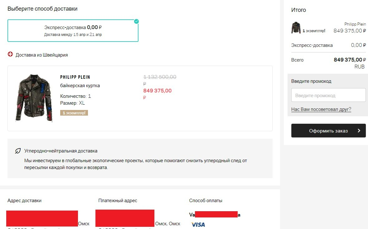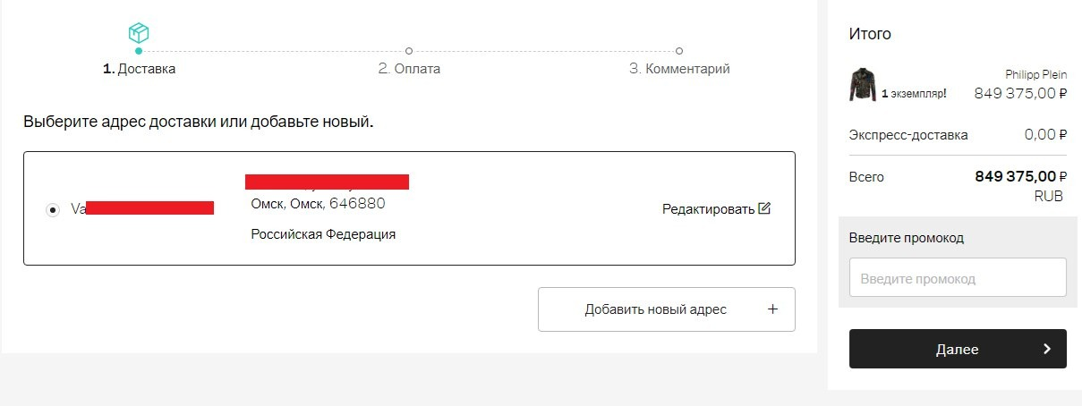 Закинули шмотку в корзину, пару мин думаем и нажимаем "Перейти к оплате".